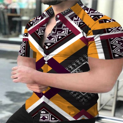 Men's Summer Casual Short Sleeve Shirts Abstract Print Low Elasticity Male Shirt Slim Fit Casual Lapel Top