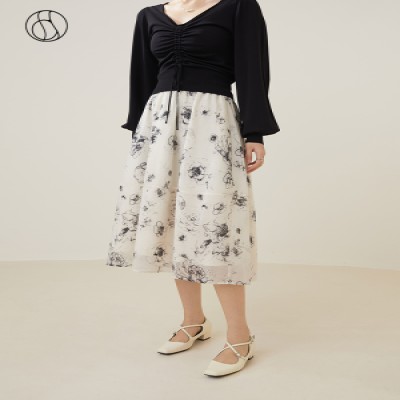 DUSHU Design Sense Women Ink Skirts Autumn Rose Elegant Retro Printing Dyeing High Waist Umbrella Skirt Female Bottoms