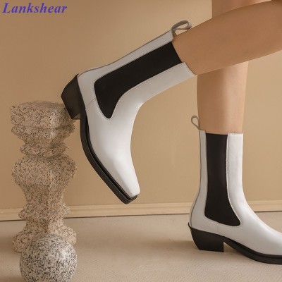 Low Heel Square Toe Boots Casual Cowhide Thick Sole Personality Ladies Large Size Short Boots Ladies Cowhide Boots