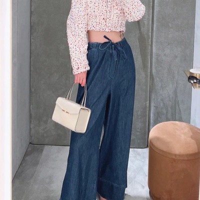 22 Summer Elastic Thin Denim Waistband Wide Leg Pants Women Casual Blue Wide Hem Trousers Luxurious V Hardware Straight Trouser