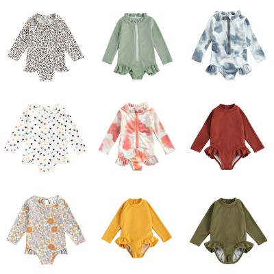 1-5Y Toddler Kids Baby Girls Swimwear Knitted Front Zipper Long Sleeve Ruffles Summer Swimsuit Jumpsuits Bathing Swimming Suit