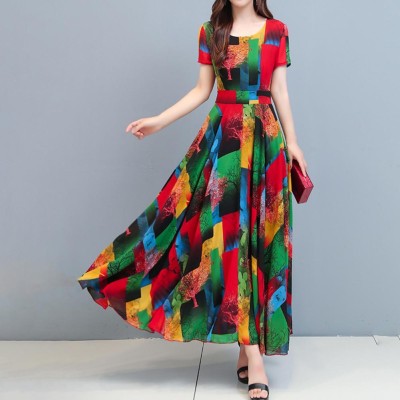 Women Dress Imitation Ice Silk Colorful Print Round Neck Large Hem Summer Elegant Casual A-Line Long Dress Streetwear