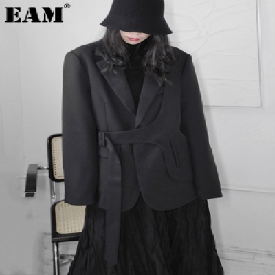 [EAM] Women Black Big Size Sashes Irregular Blazer Lapel Long Sleeve Loose Fit Jacket Spring Autumn 1DD7352