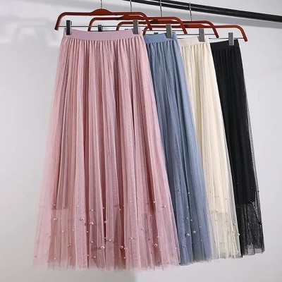 Style Maxi Long Tulle Skirt Women High Waist Summer Autumn Vintage Harajuku Pink Elastic Waist Pleated Tutu Skirt