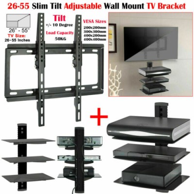 26" - 55" Tilt TV Wall Bracket Mount With 3 Tier Glass Shelf DVD Player Sky Xbox
