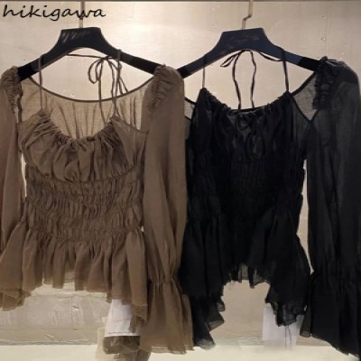 Blouse Women Sexy Off Shoulder Long Sleeve Thin Shirts Slim Folds Flare Sleeve Blouses Vintage Tops Femme Blusas De Mujer